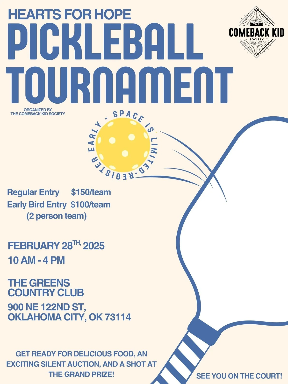 Mark your calendars for February 28th, 2026, and get ready for a day of pickleball, delicious food, and friendly competition at The Greens Country Club! Whether you’re a seasoned player or new to the game, this event is a perfect mix of fun and purpose. With a grand prize, silent auction items, and all proceeds supporting The Comeback Kid Society, it’s a chance to make a difference while having a blast on the court.